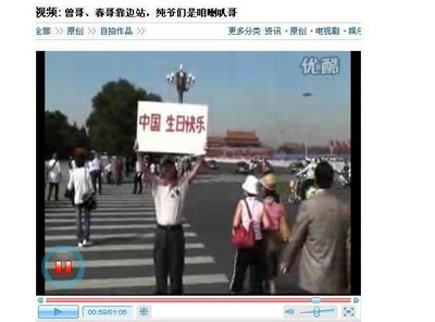 廣州2009年9月28日電 /美通社亞洲/ -- 祖國六十大壽,普天同慶。隨著國慶的臨近,優酷網友向祖國母親獻禮的活動也一浪高過一浪(活動專題://news.youku.com/niurenxianli )。繼9月9日優酷牛人“藝丐”從蘭桂在優酷的幫助下如愿在八達嶺長城東平臺作粉筆畫6副,且作品悉數被八達嶺長城歷史博物館永久收藏,拉開向祖國母親獻禮的序幕后,各行各業擁匯聚民間智慧的“優酷牛人”也紛紛以自己的方式為祖國獻禮:“菏澤老年大學60位老人歌唱祖國”、“跑酷牛人60周年特別獻禮”、“沙畫牛人楊琪國慶音樂沙畫”、“音樂牛人關喆《紅旗飄飄》鋼琴彈唱”、“千萬寶寶視頻叫‘媽媽’視頻征集”等已全面展開。而近日由百名卡車司機自創的一套別開生面的喇叭生日歌則成為國慶獻禮的大熱門,該視頻在優酷的點擊量已超百萬,超過5000多名網友在視頻后跟帖評論,關注度屢創新高。